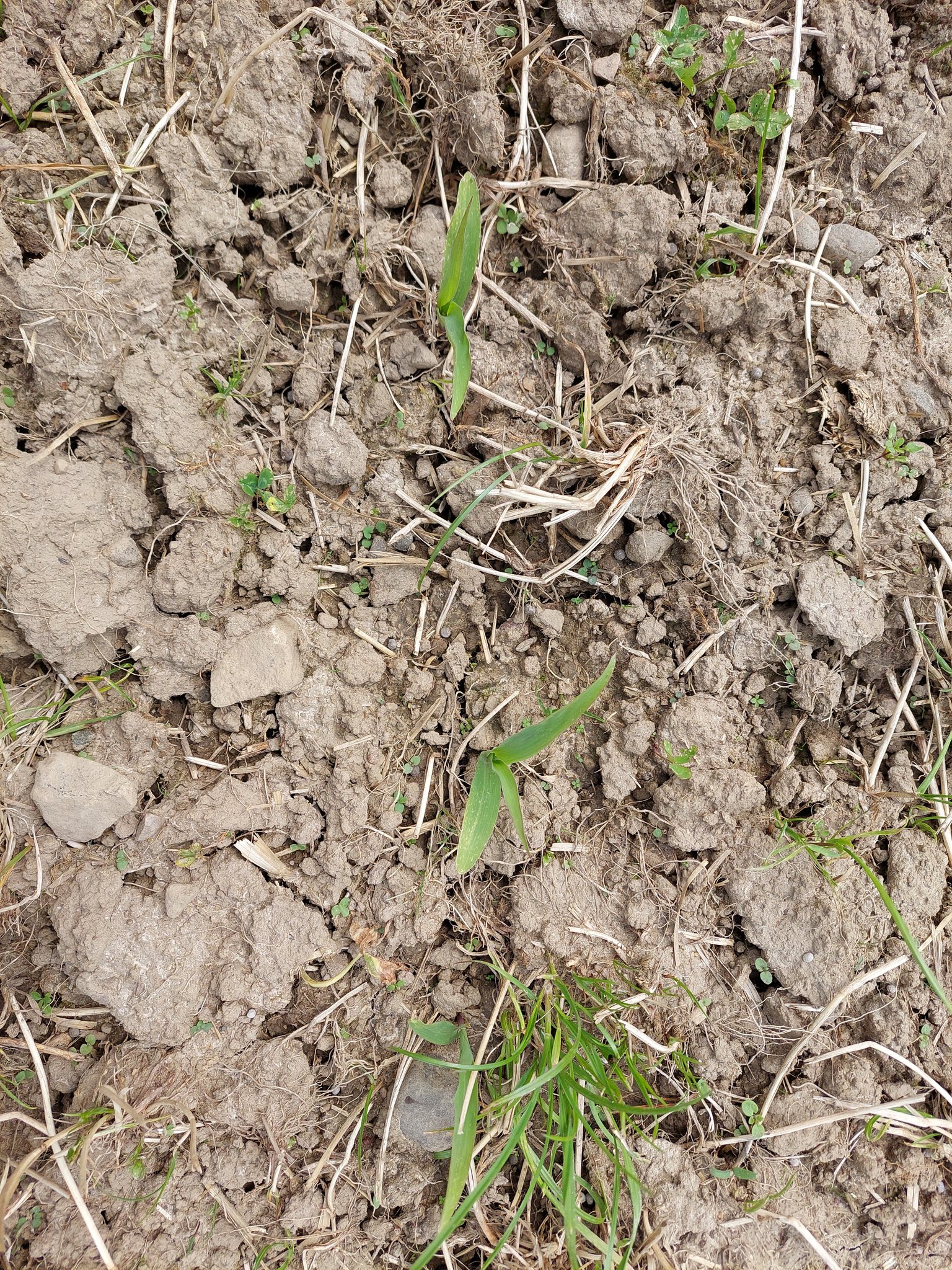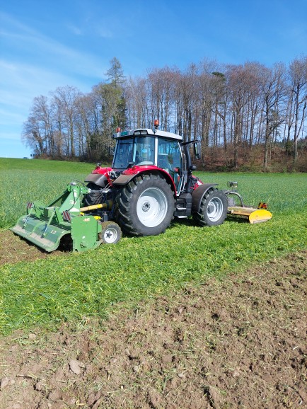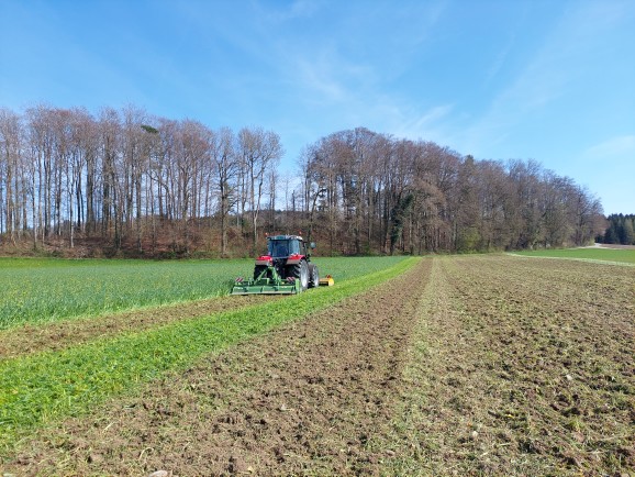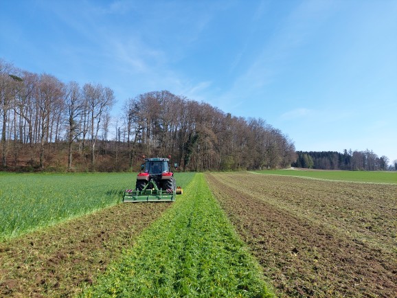 Nachdem die Maissaat erst vor dem grossen Regen gemacht werden konnte, ist das Gras wieder am Anwachsen. Vorsichtiger Durchgang im BBCH 11.