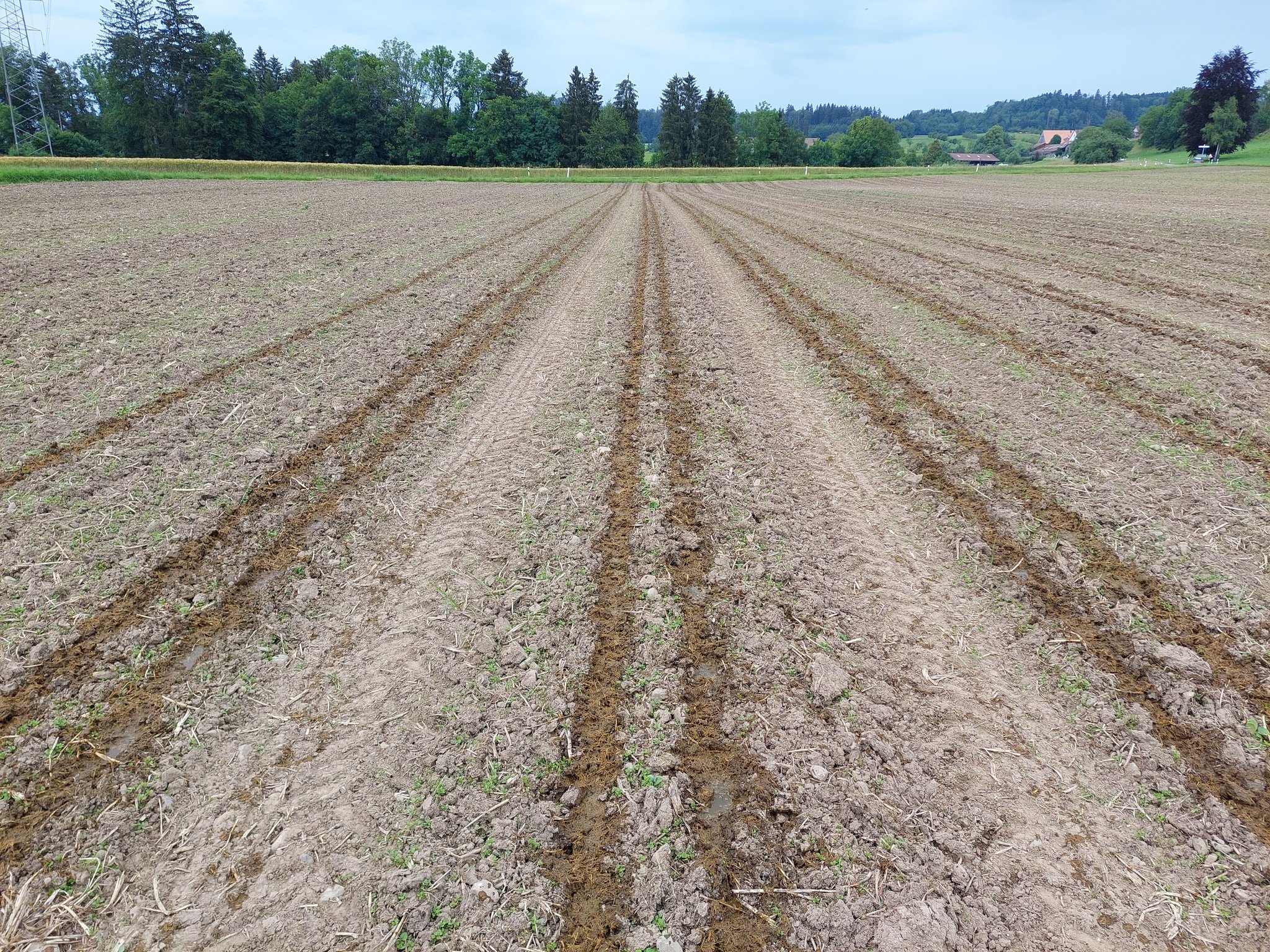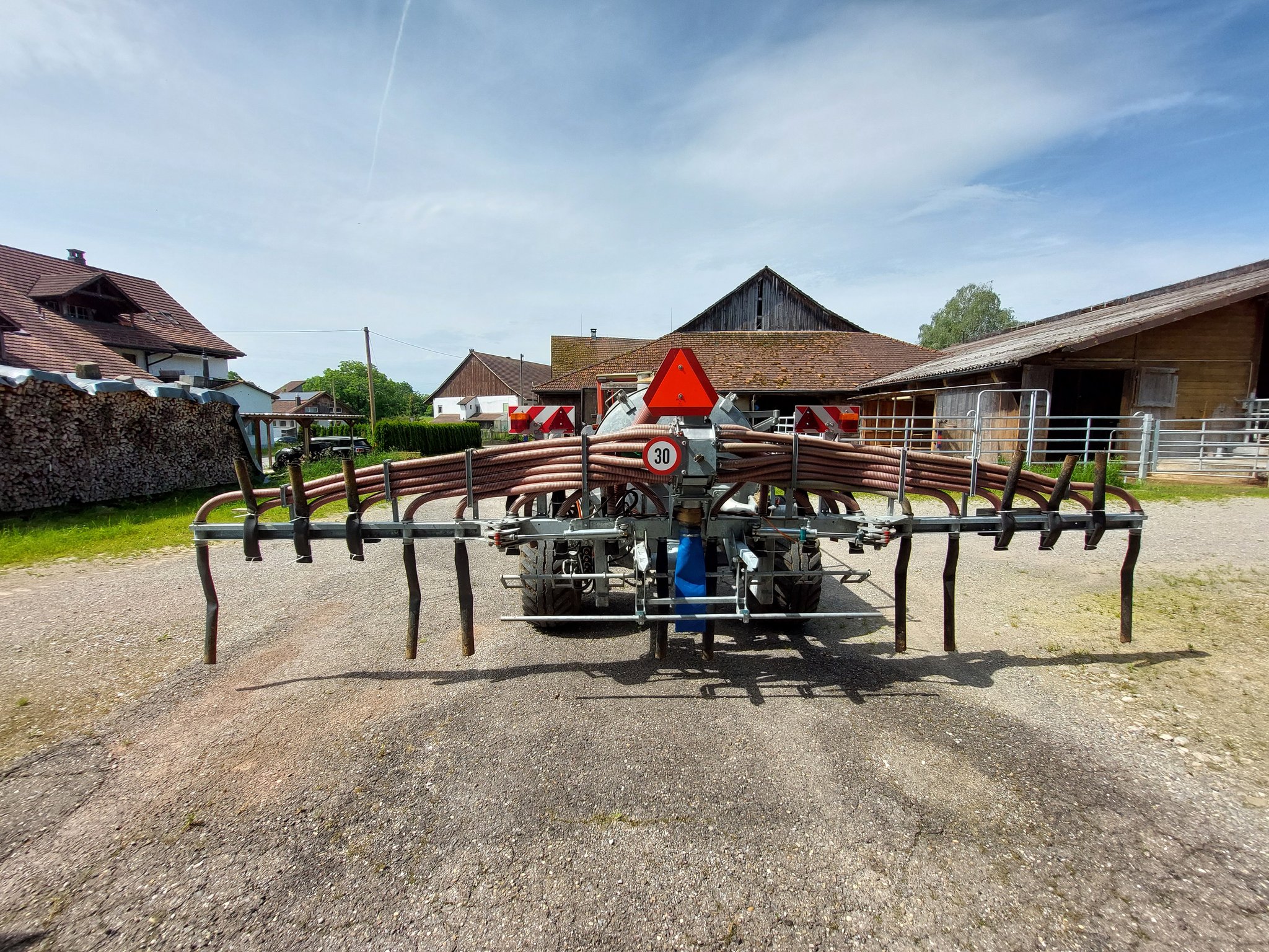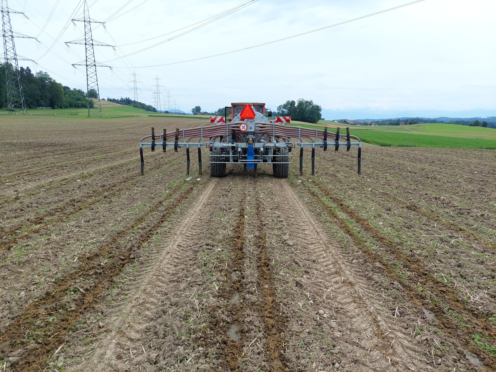 Die Kürbis werden bei uns mit 1.50 m Reihenabstand gesäet. Dadurch werden die Flächen Zwischen den Reihen erst spät durchwurzelt. Damit möglichst wenig Nährstoffe verloren gehen, habe ich am 8.6.2024 zum ersten mal mit dem neu gebauten Schleppschlauchfass die Güle links und rechts neben die Kürbisreihe ausgebracht.